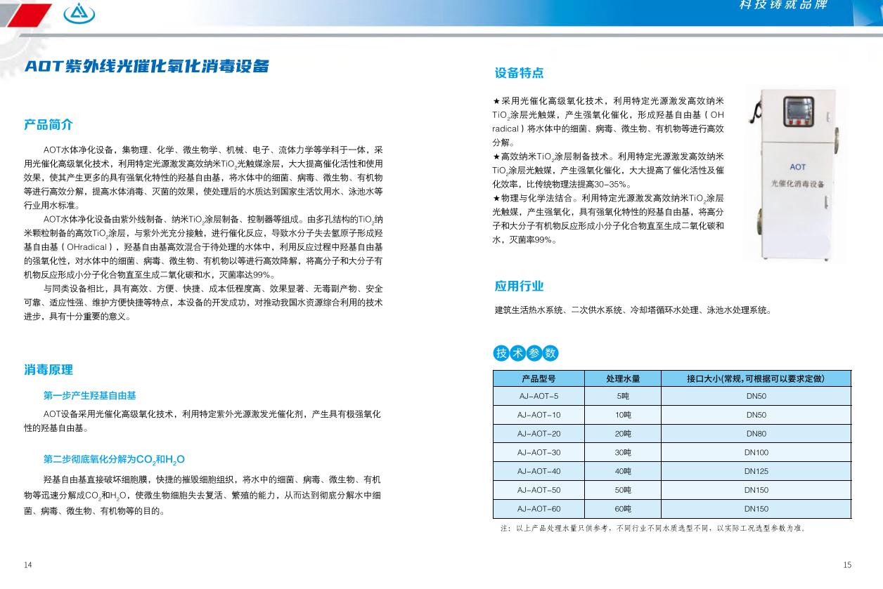 AOT光催化設(shè)備利用先進(jìn)的光催化技術(shù)對(duì)水體中的有機(jī)物、微生物、病菌病毒等進(jìn)行徹底的氧化分解,在此過(guò)程中不添加任務(wù)化學(xué)制劑,不生成任何有害的副產(chǎn)物。